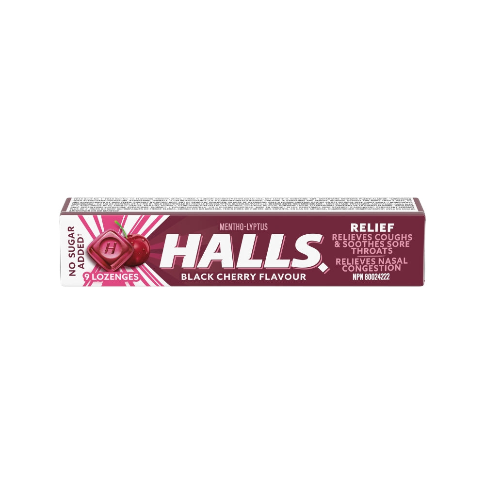 • HALLS Sugar Free Black Cherry Flavor Cough Drops provide Triple Soothing Action: Relieves Coughs, Soothes Sore Throats, Cools Nasal Passages.
